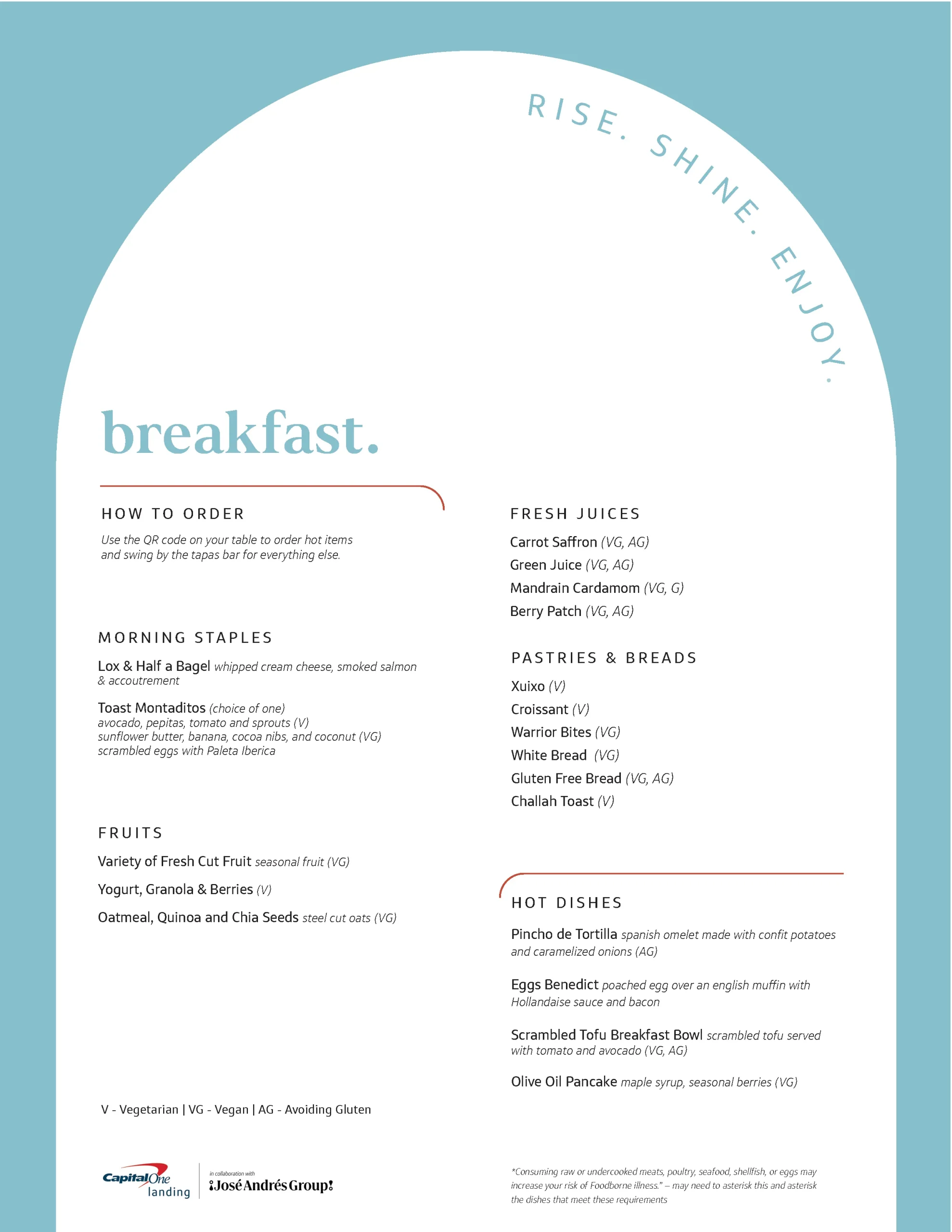 Depending on time of day, you can find either the breakfast options, or the lunch/dinner options. For reference, here is the menu for both with drinks menu also included that is the same no matter what time of day.